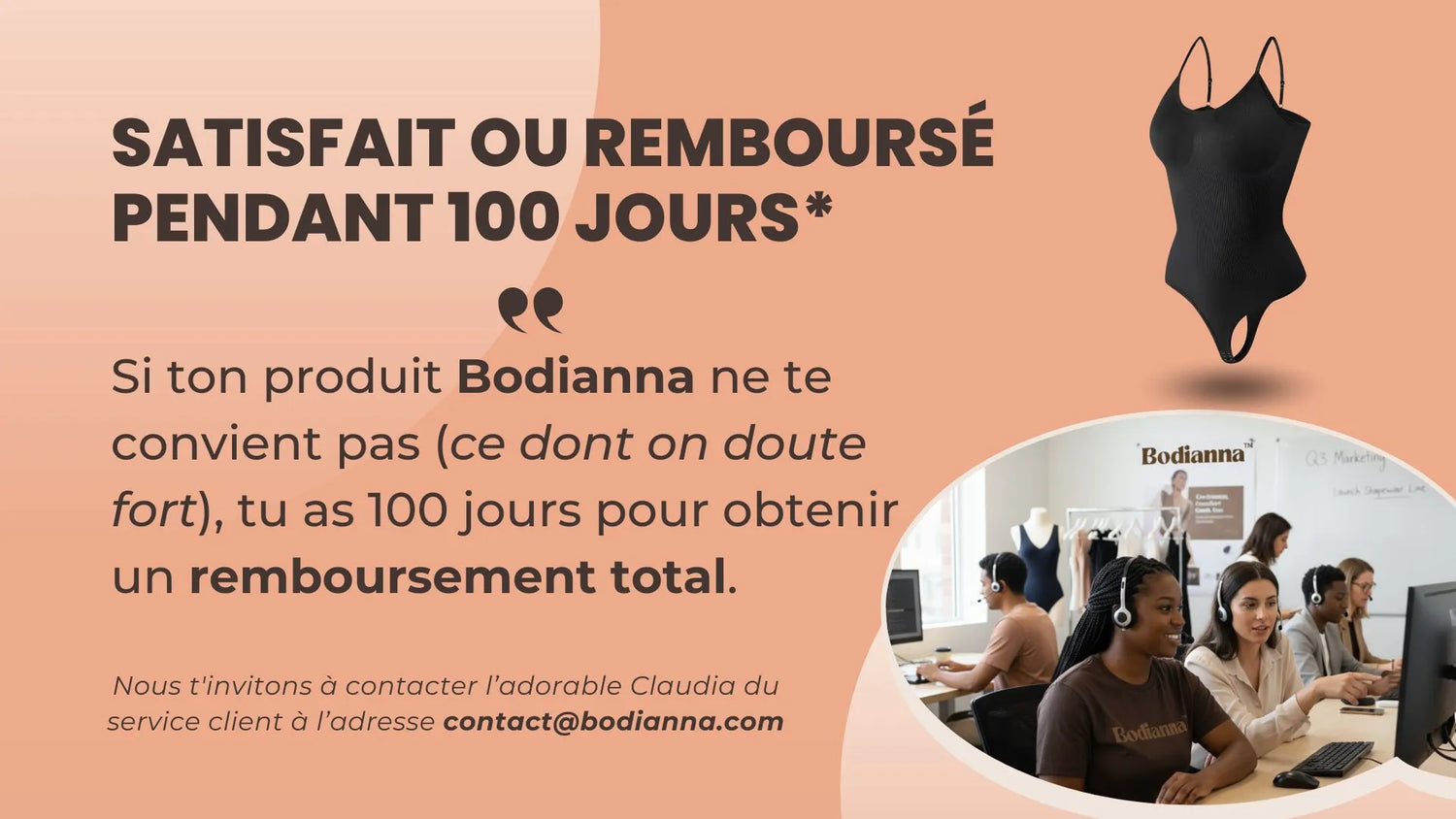 Si ton produit Bodianna ne te convient pas (ce dont on doute fort) , tu as 100 jours pour obtenir un remboursement total. Nous t'invitons à contacter l’adorable Claudia du service client à l’adresse contact@bodianna.com